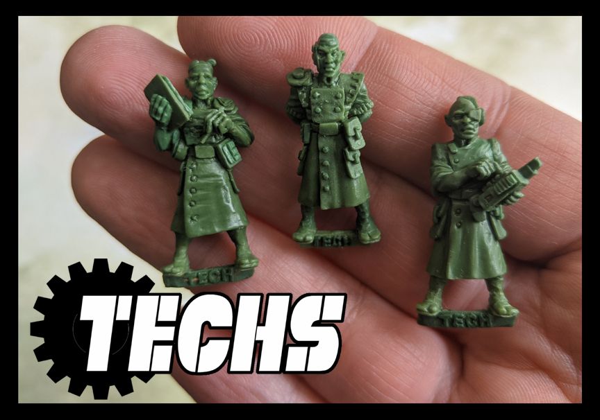 These are our three Techs, Doctors Deller, Cavor, and Cenva. They are designed as unarmed, stand 28mm tall and are made of metal. They are tabbed and designed in the style of classic sci-fi figures made in the 1980's.